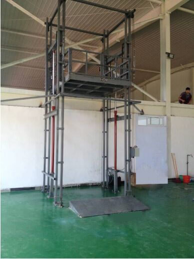 導(dǎo)軌式升降平臺是一種垂直升降作業(yè)的簡易升降平臺。此設(shè)備采用液壓油缸頂升、鏈條及鋼絲繩拉動工作臺,起升到目標(biāo)高度后,通過限位開關(guān)自動與樓層平層。
